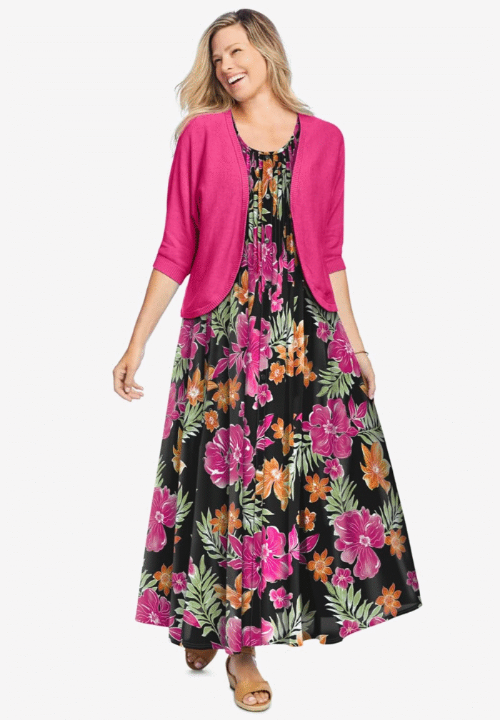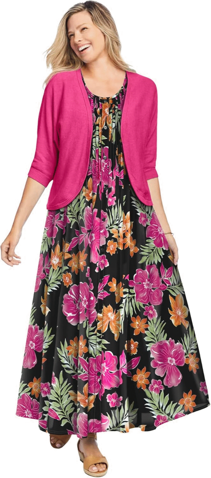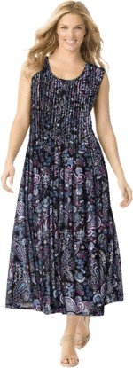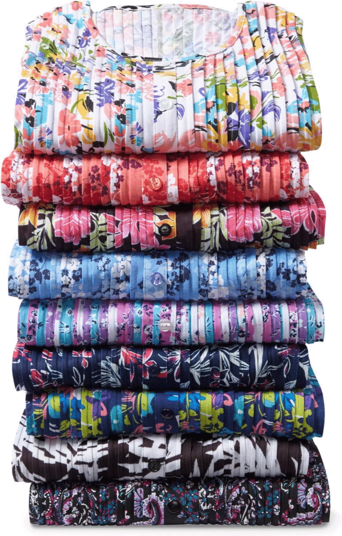br> Elegant pintucked design in front and back for a flattering silhouette Sweeping flared skirt adds a touch of grace and movement Faux button-front detail for a polished look Available in stunning prints for a vibrant and cheerful wardrobe Ultimate comfort with a soft poly/rayon knit fabric Perfect for layering with a cute cardigan for versatile styling Average length: 52″, Petite length: 48″ Conveniently machine washable for easy care Imported